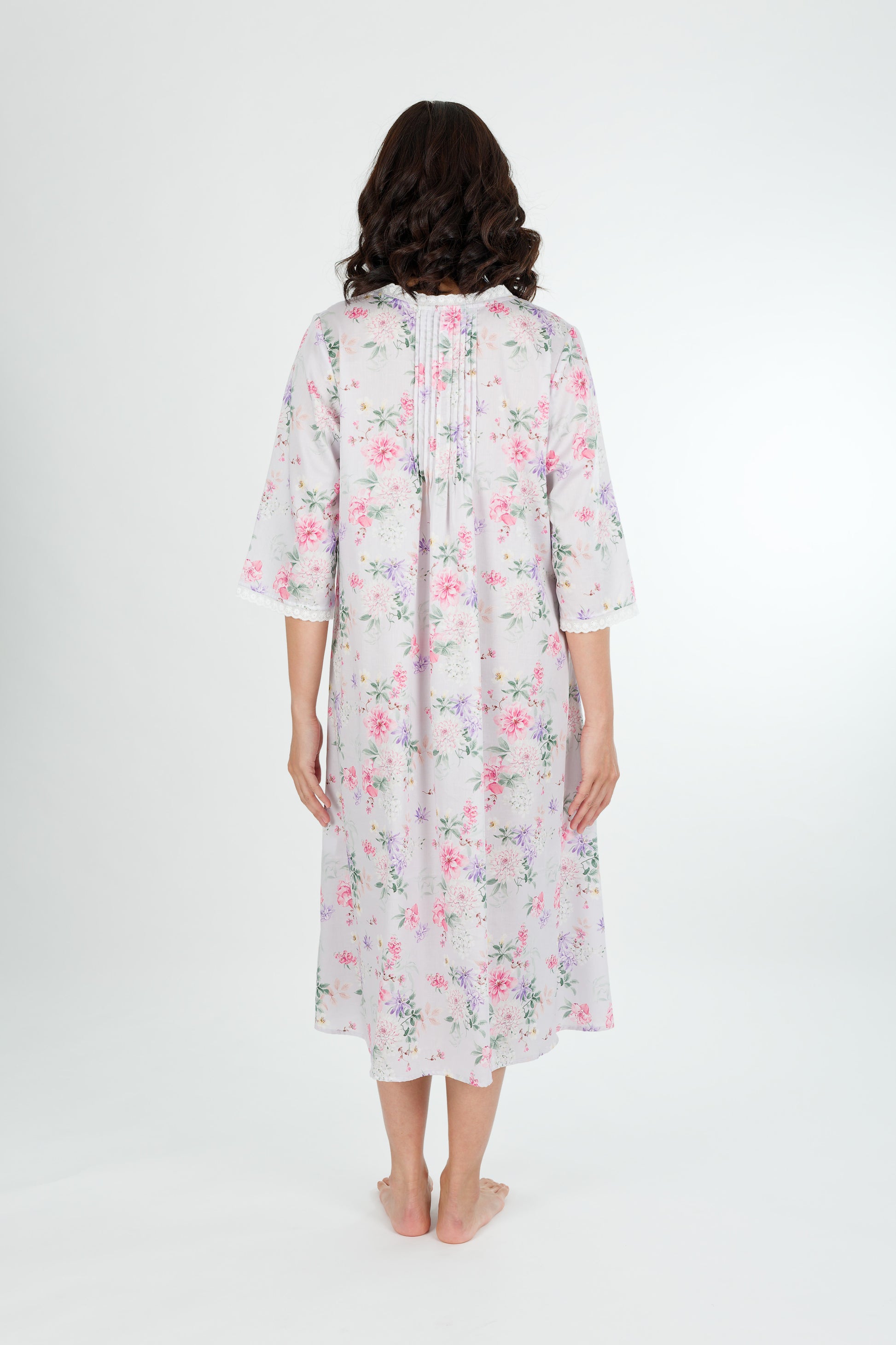Unwind in style with our beautifully soft cotton nightie in a gorgeous floral print. Woven from 100% cotton with a subtle satin finish, this nightie feels silky to the touch and is perfect for warm evenings or relaxed mornings. Designed with thoughtful details – a lace-trimmed V neckline with a sweet center bow, fine pintucks on both front and back panels, and elegant ¾ sleeves edged in lace. Falling below the knee, it’s a graceful and breathable addition to your sleepwear wardrobe.