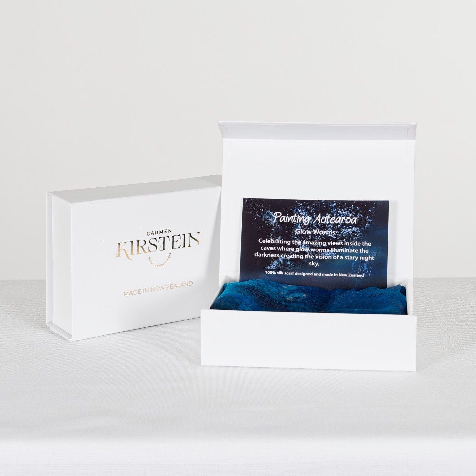 Inspired by the magical glowworm caves of New Zealand, this silk scarf captures the mysterious beauty of the underground world. Deep shades of midnight and indigo evoke the still darkness of the caves, while scattered points of soft turquoise and pale blue light represent the glowworms shining like tiny constellations above. Originally painted as an abstract artwork, the design conveys a sense of quiet wonder and discovery. Printed onto pure silk, this scarf transforms the enchantment of the caves into an elegant piece of wearable art.