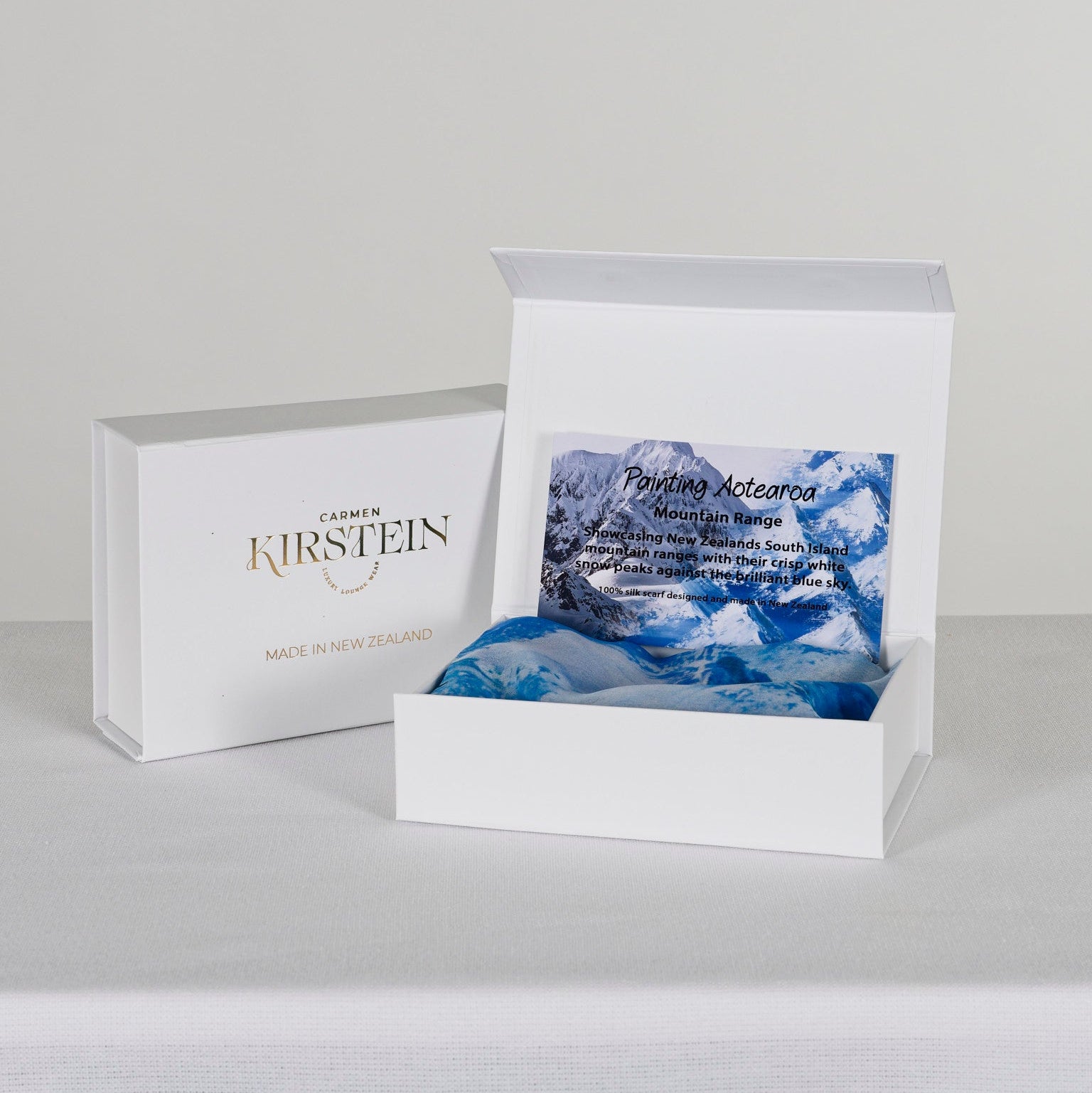 Inspired by the majestic mountain ranges of New Zealand’s South Island, this silk scarf captures the drama and beauty of the alpine landscape. Soft gradients of blue and grey mirror the distant peaks, while touches of white evoke the crisp snow that crowns their summits. Painted as an expressive interpretation rather than a literal scene, the artwork conveys the stillness and grandeur of the mountains under a clear southern sky. Printed onto pure silk, this scarf is a timeless piece of wearable art — elegant, serene, and distinctly New Zealand.