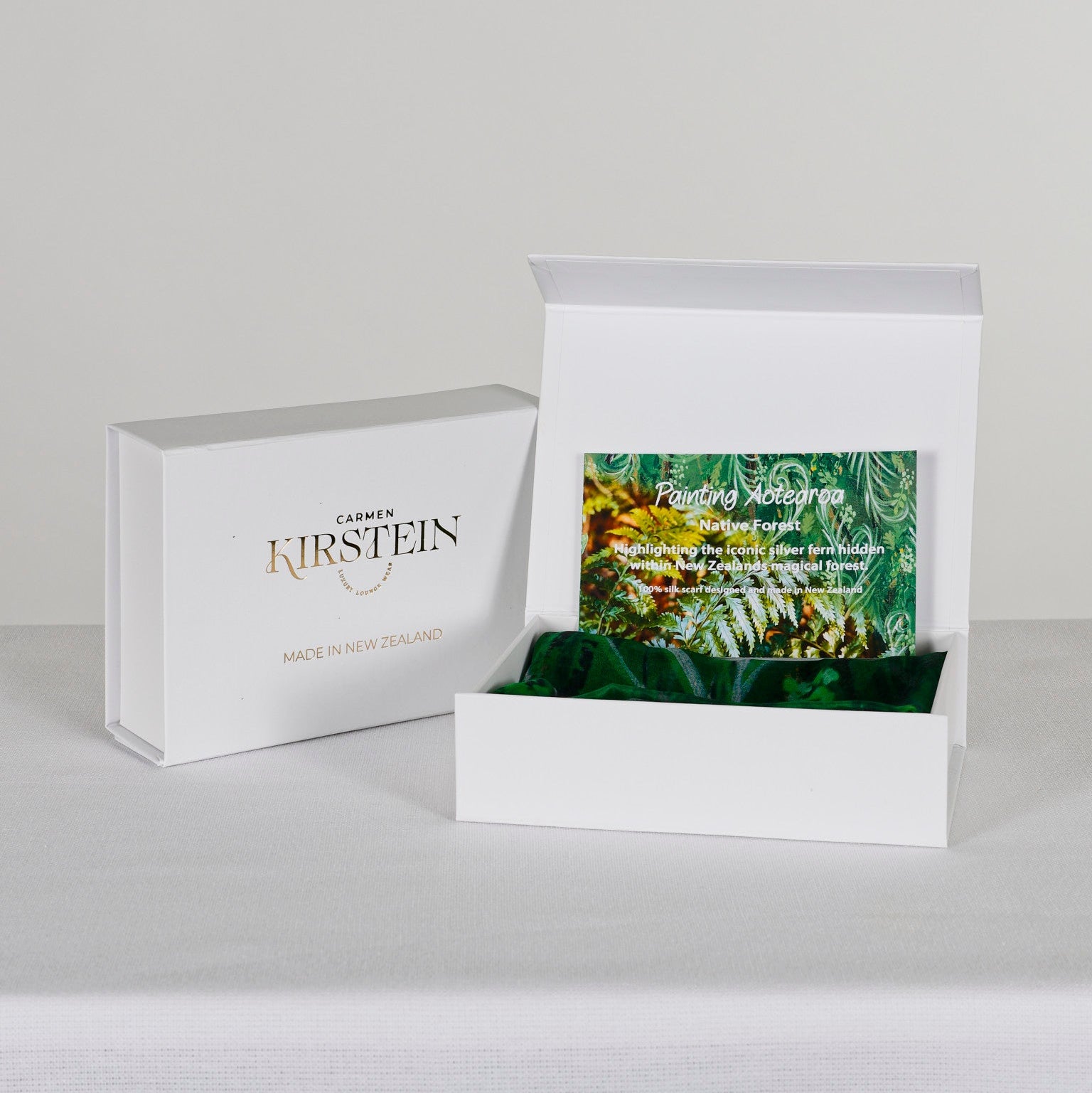 Inspired by the lush native forests of Aotearoa, this silk scarf captures the layered greens and soft earthy browns found beneath the forest canopy. Flowing brushstrokes suggest dappled light and movement, while a graceful swirl represents the unfurling frond of the punga — a symbol of renewal and growth. Printed from an original artwork onto pure silk, this piece brings the calm and vitality of the New Zealand bush to a luxurious, wearable form.