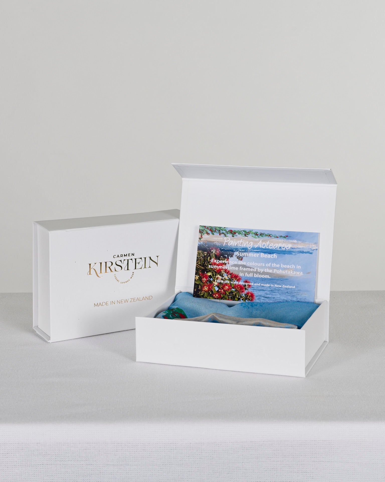 Bright blues echo the clear summer sky, deep ocean tones bring a sense of calm, while soft sandy beige and the vibrant greens and reds of the Pōhutukawa in bloom complete the palette. The original painting has been carefully photographed and printed onto luxurious silk, then sewn into a timeless scarf that’s both wearable art and a celebration of New Zealand’s coastal summer.