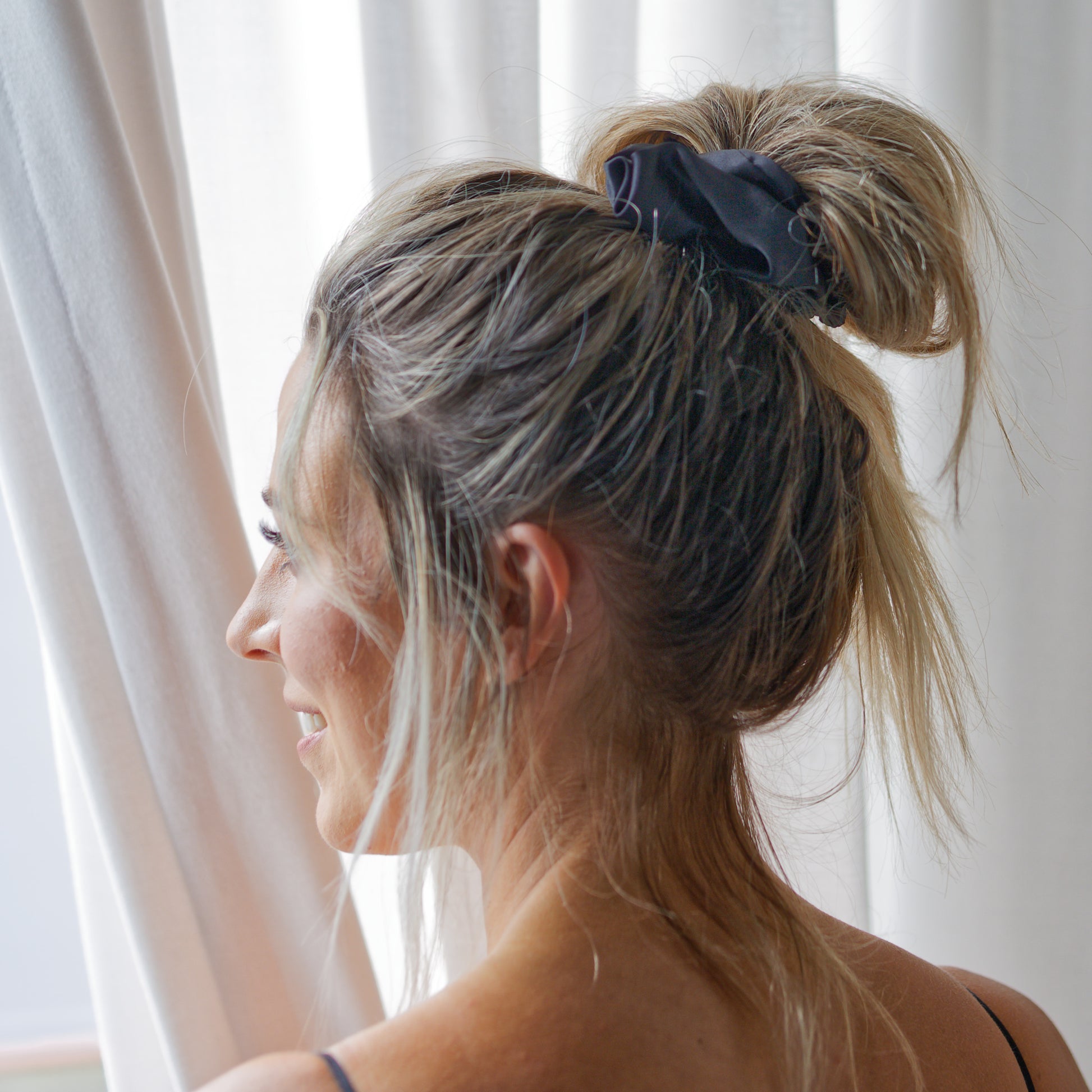 Lounge with our scrunchie in striking black 19momme silk. Gift to a friend or treat yourself with one!