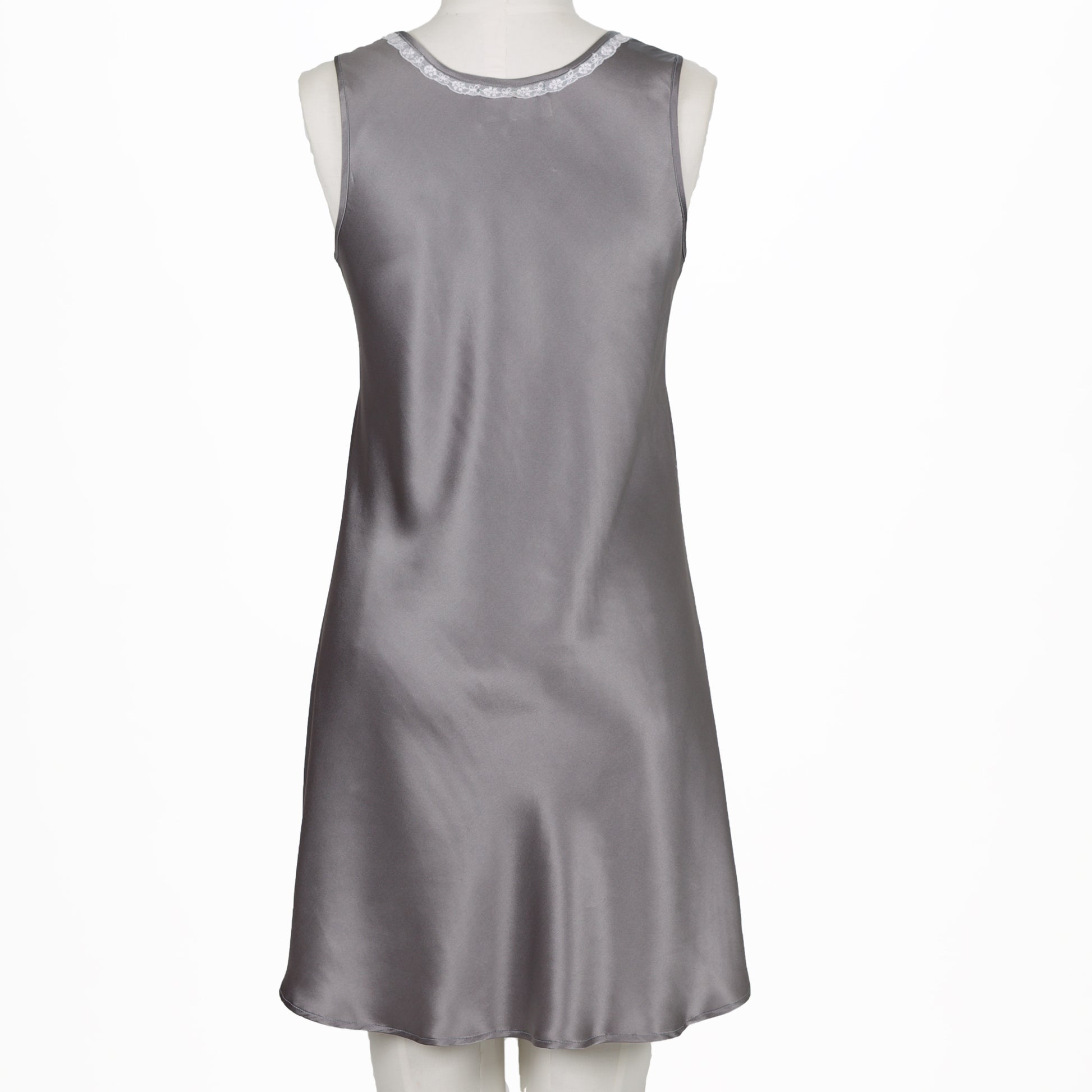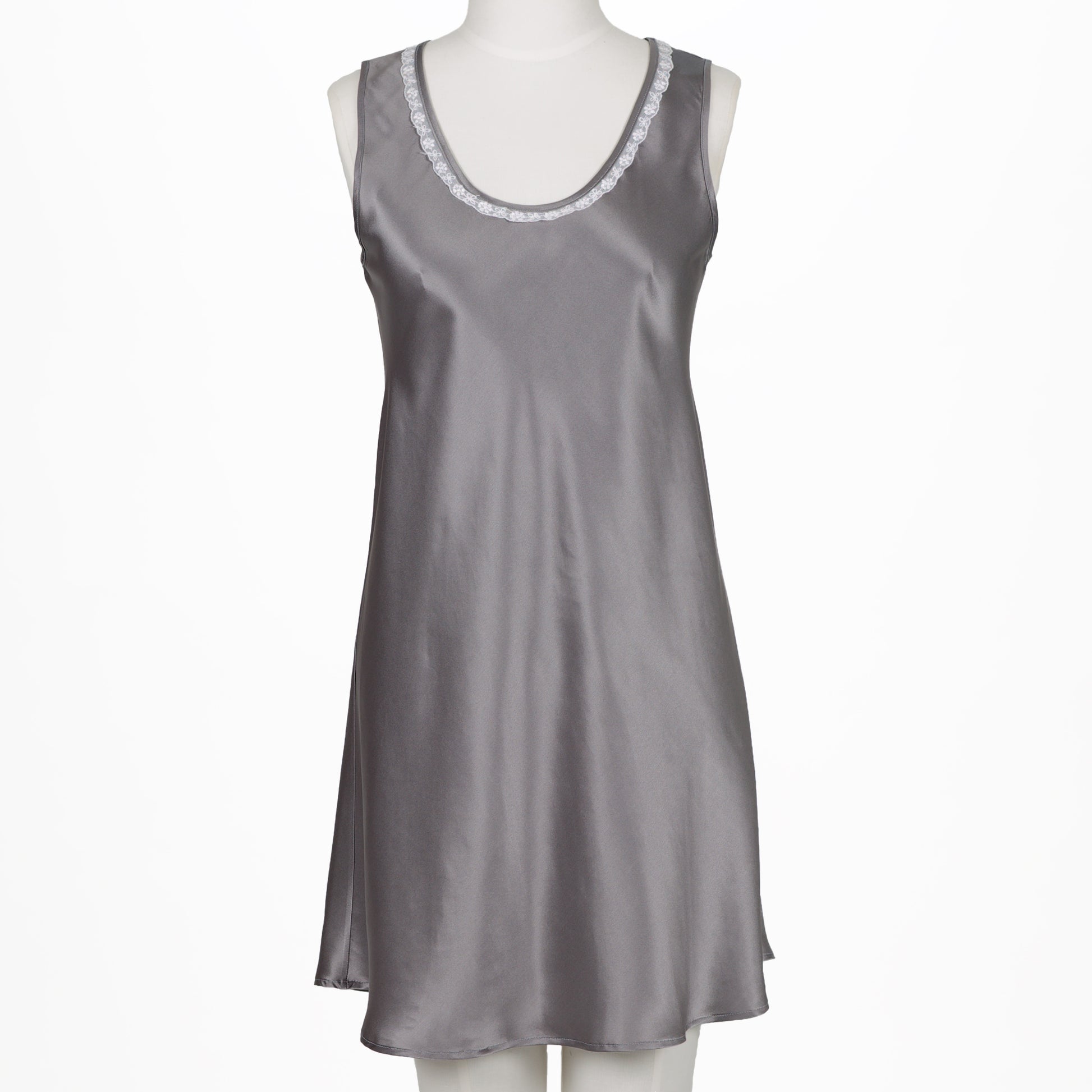 Say hello to our newest design and one that will become a favourite! The bias-cut singlet dress is perfect for those who are looking for a silk dress with the wider straps. Bias cut and ending mid-thigh, the stunning gunmetal brings out the delicate lace trim around the neckline. This singlet dress can be worn under your winter dresses or will become your favourite night dress.